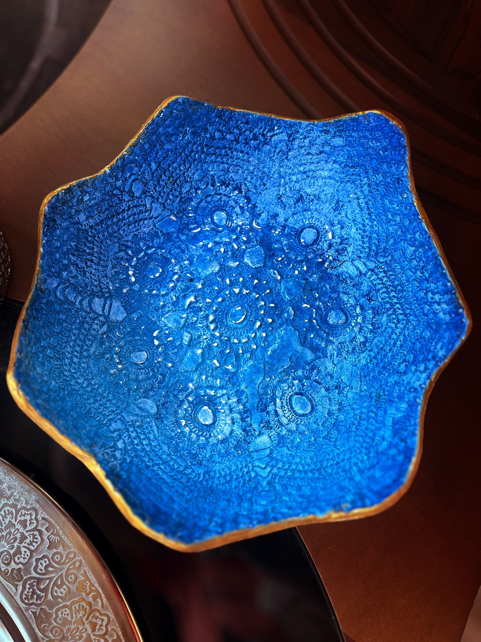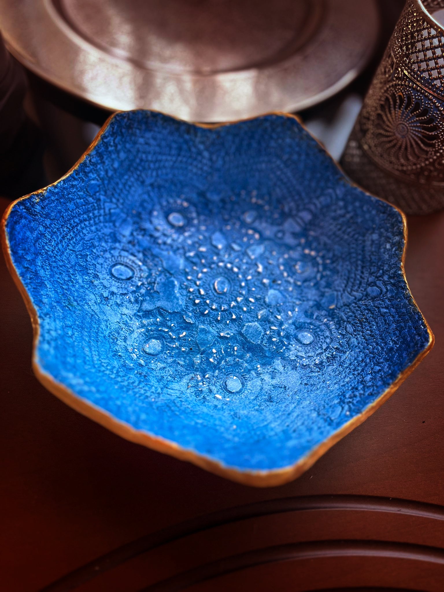 O piesă decorativă cu prezență regală și rafinament artizanal. „Blue Mirage” este un platou lucrat manual din ceramică, cu o formă organică și marginile accentuate subtil în auriu. Interiorul vibrant, în nuanțe intense de albastru cobalt, este decorat cu un model delicat, în relief, ce amintește de dantelă fină sau mozaic oriental.